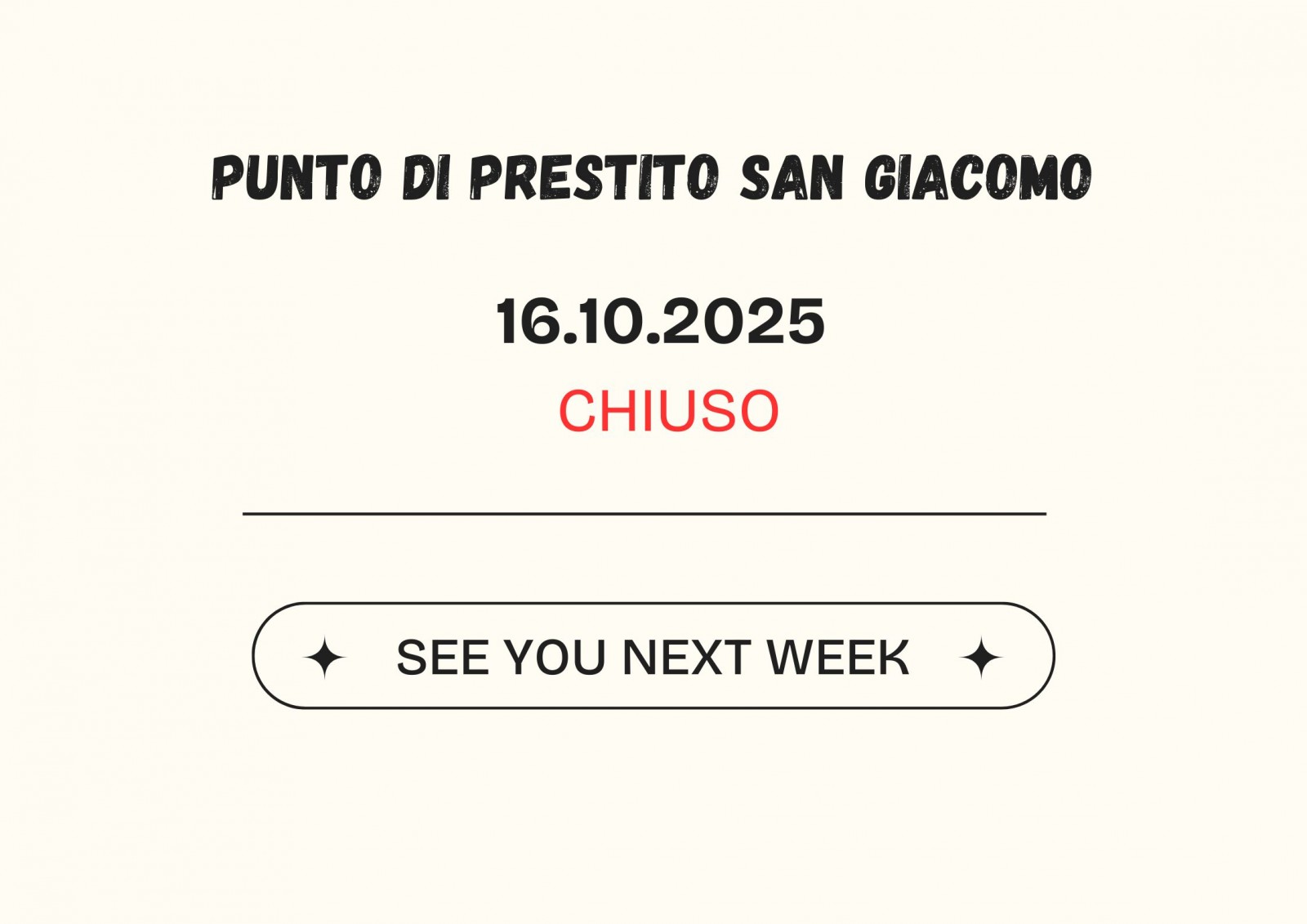 Avvisiamo i gentili lettori che giovedì 16 ottobre il punto di prestito di San Giacomo rimarrà chiuso.