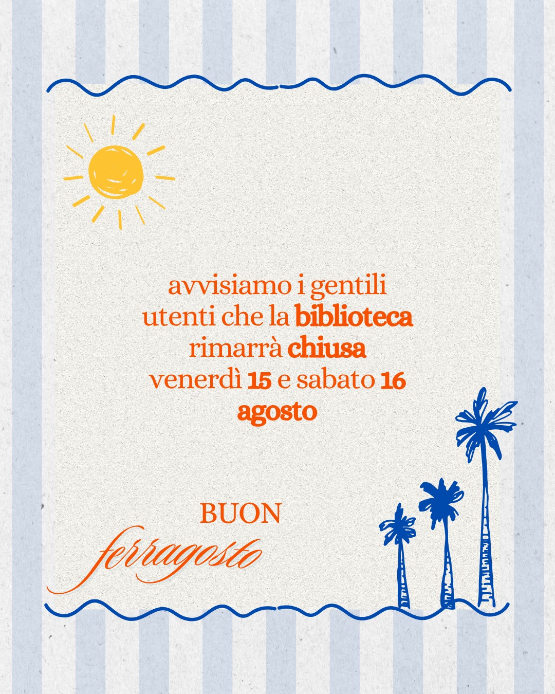 Avvisiamo i gentili utenti che la biblioteca rimarrà chiusa i giorni venerdì 15 e sabato 16 agosto.